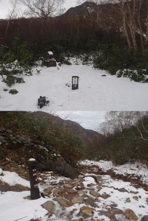 この2枚の写真の間は「胸突き八丁」という別名の通りの急な登山道で、雪が20cmほど着いていて歩きにくい状況でした。ここもアイゼンを装着したまま下りました。