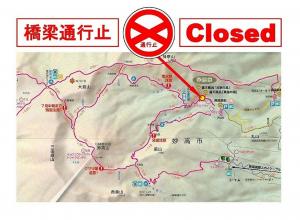この「妙仙橋」について、橋全体を雪害から守るための養生を行うため、11月5日より冬季通行止めとさせて頂くことになりました。