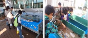 【こども水族館の様子(写真左)とタッチプールで生き物に触れあう子どもたち(写真右)】