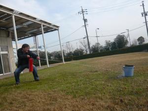 消火器が設置されている場所が把握できていても、使用方法が分からなければ何の意味もありません。そのため、消防署から訓練用消火器をお借りして、実際に消火活動が行えるよう、消火器の構造を理解し、初期消火訓練を行いました。