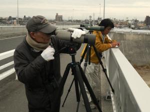 【風が通るので、橋の上での調査が一番寒いそうです。手前の方が森井さん。】