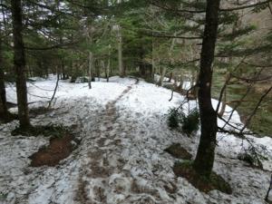 ・日陰や樹林の中には残雪があり、滑りやすくなっています。特に早朝は凍結しているので注意してください