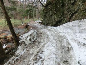 <写真>徳沢地区~横尾地区の残雪の状況:残雪が多く滑りやすい状況です。