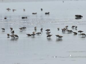春に藤前干潟を中継地として利用するチュウシャクシギやオオソリハシシギなどの