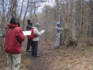 今年度最初の活動は、「鹿沢園地内の危険木選定作業」です。この所、園地内で風倒木による木道の破損があり、利用者が増えるシーズン前に鹿沢万座PVと確認作業を行いました。ノコギリで切れる樹木についてはその場でギコギコ・・・