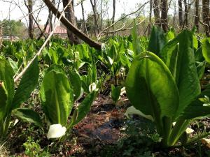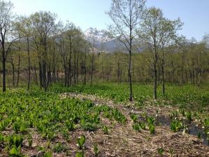 先週まで一面、白い仏炎苞で満たされていた湿原は、週末から今日までの暖かさのお陰もあり、葉の緑が強くなっていましたが、まだところどころ白いミズバショウもみられ、今日も、暖かな春の日差しに誘われたのか、多くの来訪者の皆さんで賑わっていました。