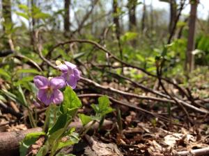 周りをよく見わたせば、ミズバショウの大きな葉の下にピンク色のショウジョウバカマの花がひっそり咲いていたり、遊歩道脇ではスミレの仲間も多く見みることができました。