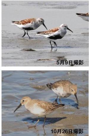 【ハマシギ(上が夏羽、下が冬羽) *藤前干潟では秋~春の間見られるシギの仲間】