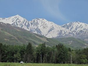 まず、残雪の白馬三山です。左から白馬鑓ヶ岳(はくばやりがたけ)、杓子岳(しゃくしだけ)、白馬岳と3つのピークがあり、これらを白馬三山と呼びます。手前は八方尾根で、麓では田植えの準備をしています。