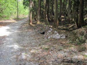 途中、標高950m付近にまだ残雪がありました。写真中央右側のスギの落葉落枝の下に白く見えるのが残雪です。