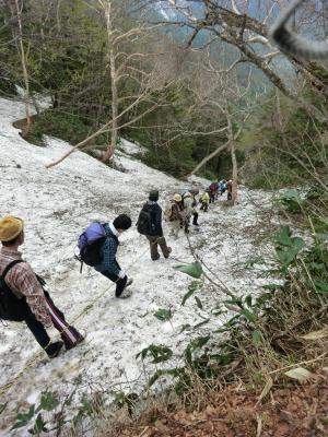 今年は、遅くに雪が降ったのと、雨が少ないせいで、山の上では雪が多いとのことで、徳本峠周辺も例外ではなく、上高地側では距離にして1.5km程度の雪渓がありました。