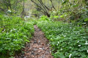 スタートの島々から上高地(明神)までは約20kmの長いルートですが、涼やかな沢風と共に、歩を進め、傾斜がきつくなるつづら折りに入ると、ニリンソウが応援してくれるかのように、白い花を揺らしてくれてました。