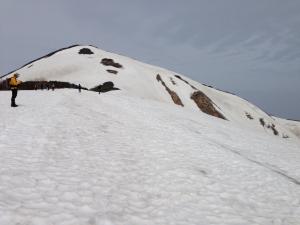 調査の皆さんとともに雷鳥平周辺のハイマツ帯をチェックしながら山頂まで探しましたが、丁度この写真の右手の、雪が消えて低木と地面が露出しているくぼ地あたりに、夏毛に生え替わったライチョウのペアを確認することができ、さらに下の谷を「ゲー」と鳴きながら移動するオスのライチョウを確認することができました。