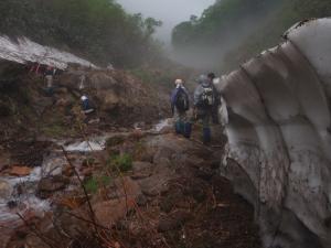 霧の中、標高1,100mほどの燕温泉を出発し、残雪の残るコンクリート作業道を上って行きます。