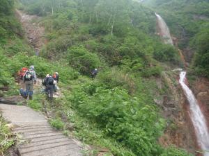 私たちのグループは、妙高市、警察署、地元ボランティアの皆さんの合計8名構成で、通称「湯道」から「川原」、「称名滝・光明滝」を通って「胸突き八丁」を越え、「天狗堂」に至るルートを担当しました。