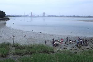 【暑い中、干潟観察会を楽しんでいた小学生たち(7月5日撮影)】