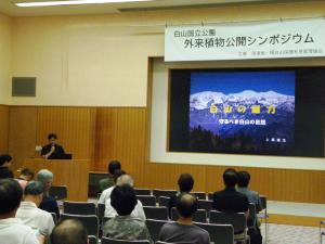 低地や外国から来た生き物から、その繊細な生き物を守ろうということを皆さんに考えてもらうために、外来植物公開シンポジウムを7月7日に環境省と環白山保護利用管理協会で開催しました。