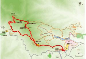 横山園地には、安全に散策を楽しんでいただけるよう、遊歩道がいろいろと整備されています。今回歩いたのは、地図の赤線のコース。