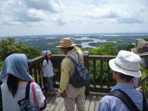 ここからだと、伊雑浦、朝熊山、青峰山、そしてお天気が良いと鳥羽市の菅島も見えます。リアス海岸の成り立ちについても教えてもらいました。