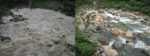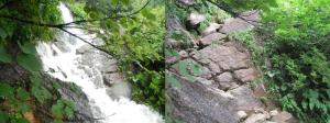 <左が前回、右が今回です。前回は滝のように流れていましたが、今回は写真では流れが分かりづらいくらいの何ということのない沢でした。なお、前回の写真は新潟県 県民生活・環境部 環境企画課の方が撮影したもの。>