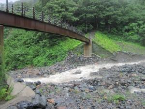 <環境省が整備した白高地沢橋。写真奥が右岸(蓮華温泉側)、8月1日撮影。>
