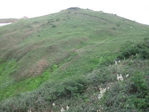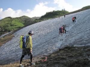 <写真奥が吹上のコル方面。一番手前の黄色いシャツは施設整備を担当する環境省の職員。この写真は8月7日に撮影したものなので、この日記が公開される日には残雪の状況が変化している可能性があります。>
