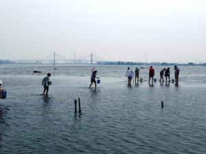 干潟に入り、参加者の皆さんでたくさんの二枚貝を探しました。