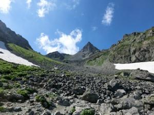 登山道は確保してありますが、写真を見ての通り非常に落石の危険があります。上方に注意し速やかに通過してください。