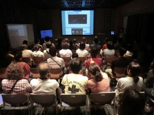 星空鑑賞前のレクチャーの様子、部屋に収まりきれないほどの盛況ぶりです。