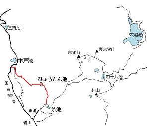 今回は渋池(しぶいけ)と木戸池(きどいけ)を結ぶコースを紹介します。下図の赤線です。
