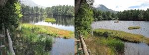 左の写真は上と同じで、右は前年の9月に撮影したものです。左の写真では2つの浮島が近い位置にありますが、右の写真では離れています。2つの写真を比べると、浮島が動いていることがはっきり分かります。