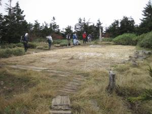 <苗場山山頂の宿泊施設の跡地は、中越森林管理署がムシロを敷いて植生回復を促しています。この部分に立ち入らないようにお願いします。>