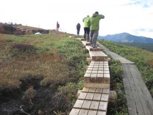 <長野県側の栄村小赤沢と苗場山山頂を結ぶ歩道でも歩道の整備工事を行なっています。場所は坪場(つぼば)付近です。また、坪場と山頂の間の木道は破損しているものがあります。注意して通行してください。>