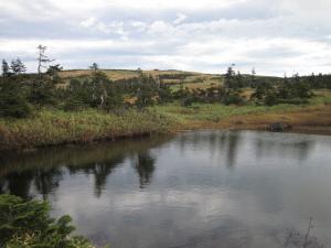 <稜線の中央辺りに宿泊施設の屋根が見えます。この池塘(ちとう)からそこまで直線距離で1km以上あります。この池塘は山頂部の湿原の中で比較的大きいもの。赤倉山に向かう歩道脇にあります。>