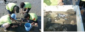 【干潟に開いた穴を掘り起こす大学生と捕らえられたヤマトオサガニ】