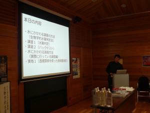 主題は「水に関わる調査の方法」。水生生物、パックテスト、透視度板を用いる方法について、それぞれ演習を交えながら教えていただきました。