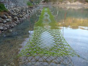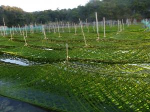 下の写真は、志摩市の冬の風物詩、アオサの養殖風景です。