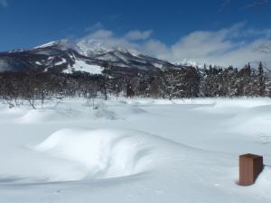 雪におおわれたいもり池のむこうには、青空をバックにした雄大な妙高山が出迎えてくれます。