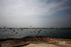 寒い日が続く藤前干潟では、カモやカモメの仲間は