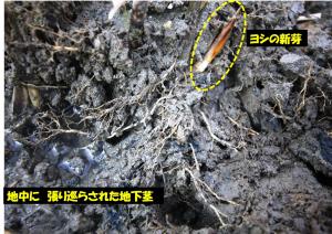 複雑に絡み合った地下茎に混じってヨシの新芽を発見しました。