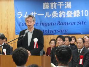 【昨年のラムサール条約登録10周年記念式典で挨拶をする千頭先生】