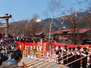 さて、上高地では4月27日に開山祭が行われました。昨年は大雪の中での開催と聞いていたので、どうなることやらと思っていましたが、今年は天候にも恵まれ、気持ちのよい開山祭となりました。河童橋のたもとで11時頃より始まり、アルプホルンの演奏、玉串奉典、鏡開きなどが行われ、今シーズンの山の安全が祈願されました。2000人以上の方が訪れたようです。