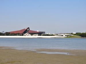 【庄内川沿いにある稲永スポーツセンター(赤い屋根の建物)】