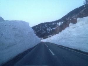 開通直後にこの区間を通過する際の見所は、道路の両側にできる雪の壁で、今年の高さは高いところで約8mだそうです。