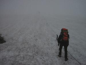 山頂直下(天神ザンゲ岩から肩ノ小屋間)の雪渓は残っています。調査時はロープが張ってありました。