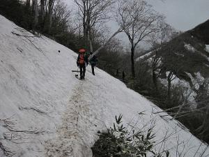 このほか、天神峠から天神ザンゲ岩までの区間では、地形により雪が残っている所もあります。中には斜面のトラバースになるところもあります。