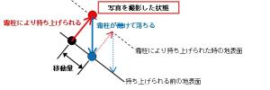写真の霜柱が融ければ、この礫は前にあった場所より斜面の下側に落ちること、そして、このような凍結と融解が繰り返されれば、結果として礫が斜面を下っていくことも想像できます(下のイメージ図参照)。