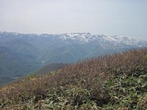 <平標山山頂から苗場山を望みます。苗場山の山頂部は、写真中央の左に向かってなだらかに傾いたテーブル状に見えるところです。山頂部には湿原が広がっています。山頂部右側の急坂(雲尾坂)も分かります。>