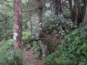 <亜高山帯針葉樹林。右下に見える白いのは残雪。>