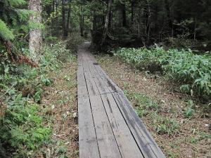 <この木道はどうして設置されたのでしょう? 私は、この辺りが湿地状であったためと推測しました。というのも、木道脇のササを刈ったところにミズバショウの花が咲いているためです。